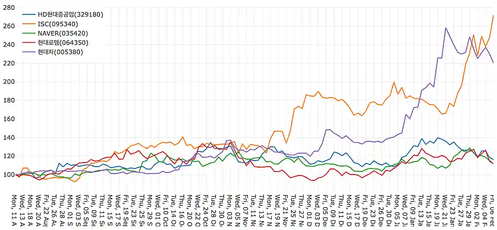 순매수 상위 종목 주가 비교 (2025.8.11=100)